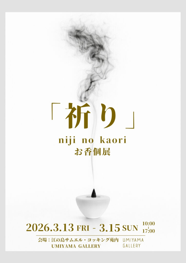湘南でオリジナルのお香を制作しているniji no kaori による個展を、江ノ島サムエル・コッキング苑内 UMIYAMA GALLERY にて、3月13日(金)〜15日(日)まで開催いたします。